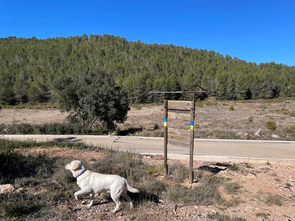 Once you have got to the summit (Alt de les Figueroles, 836m), you will have walked 6,8 km from Fuente de la Morera and ascended from 480m to 836m. The actual climb begins at 3 km from Fuente de la Morera. Up to that point, you will have been walking along a flat, easy path. Once at the top, you will descend a path which is more like an unsurfaced road so you can walk really fast. I sometimes go into military mode in these situations, and I motor along these kinds of tracks. However, this does not last for long before you have to turn off this wide path and practically go cross country through shrub. The path is not at all clear but if you follow my trail on Wikiloc you should have no problems and will eventually arrive at the end of this stage on the local road CV651 between Vallada and Moixent, where there is curiously enough a signpost painted with the Ukrainian flag. A sign of the times!